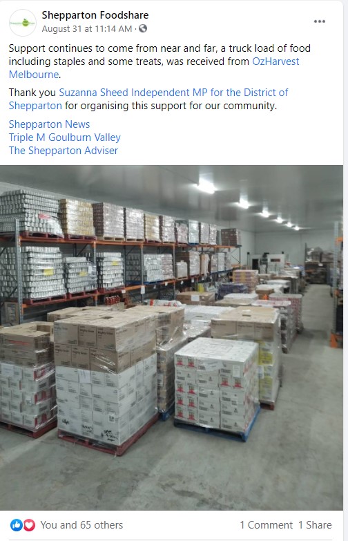 OzHarvest also responded swiftly to emerging needs in the community, such as the recent food supply challenges faced by residents of Shepparton in August 2021. With nearly 30% of the town’s workforce in isolation and supermarkets struggling due to lack of staff, OzHarvest quickly coordinated the delivery of 20 pallets of nourishing food which was provided to their local partner on the ground, FoodShare.